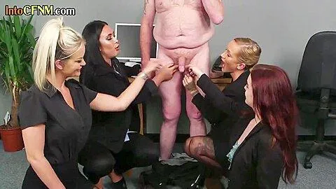 Cockhungry CFNM babes blowing subject in office