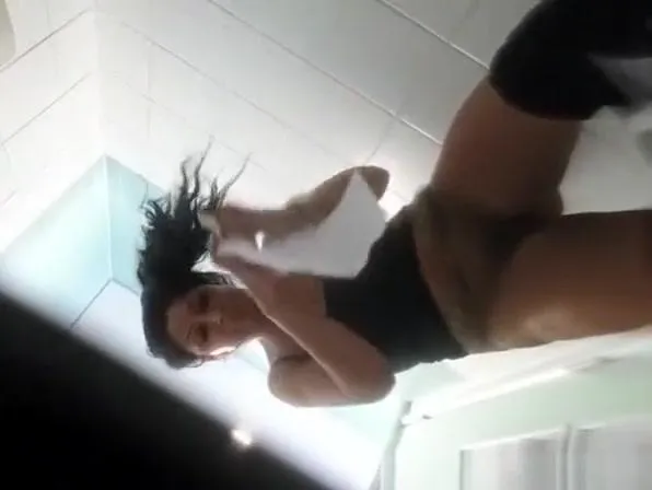 Long hair brunette woman spied in public toilet